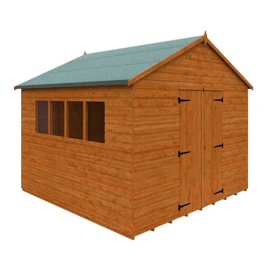 Four fixed windows provide natural light, while the water-based burnt orange treatment and grey mineral felt roof ensure long-lasting weather protection and security.